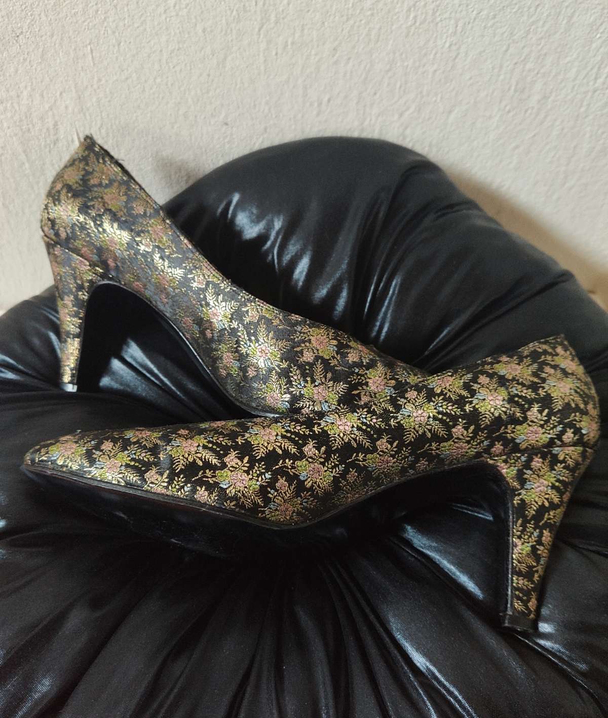 Zapatos de tacón de los años 90 con motivos florales. El Tacón mide 7,5cm. y parece que no han dado muchos pasos, están muy bien conservados..Esperan a Señor@s que quieran subir a un tacón sin perder demasiada comodidad.